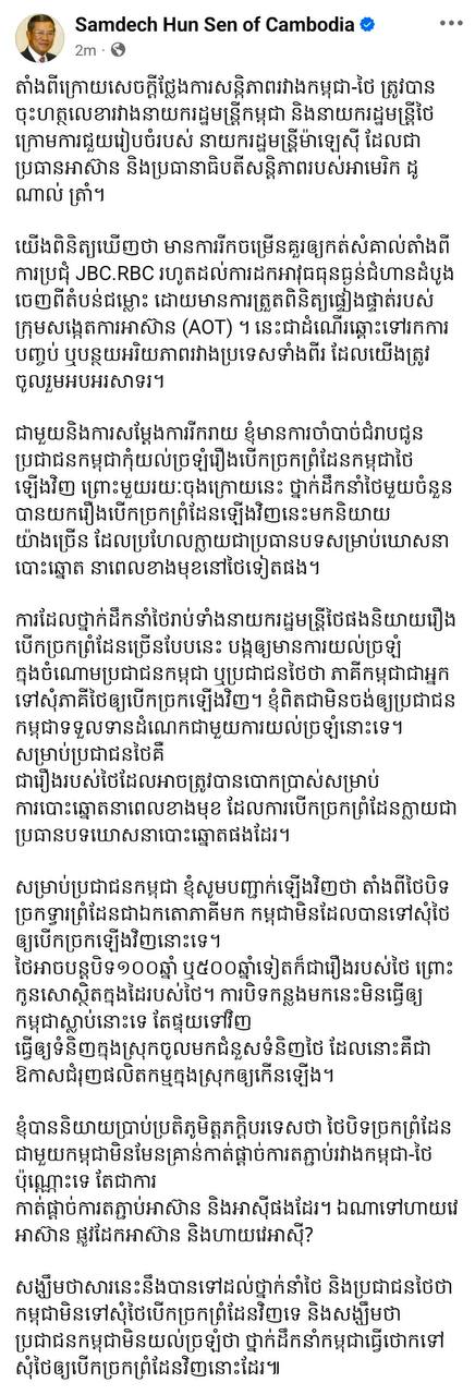 November 4, 2025 — Samdech Akka Moha Sena Padei Techo Hun Sen, President of the Senate of the Kingdom of Cambodia, posted on his social media channel that notable progress has been made since the signing of the Joint Statement between Cambodia and Thailand. The agreement, facilitated by the Malaysian Prime Minister in his capacity as ASEAN Chair and U.S. President Donald Trump as Peace Envoy, has led to the convening of JBC and RBC meetings and the initial withdrawal of heavy weaponry from the disputed area under the supervision and verification of the ASEAN Observers Team (AOT).