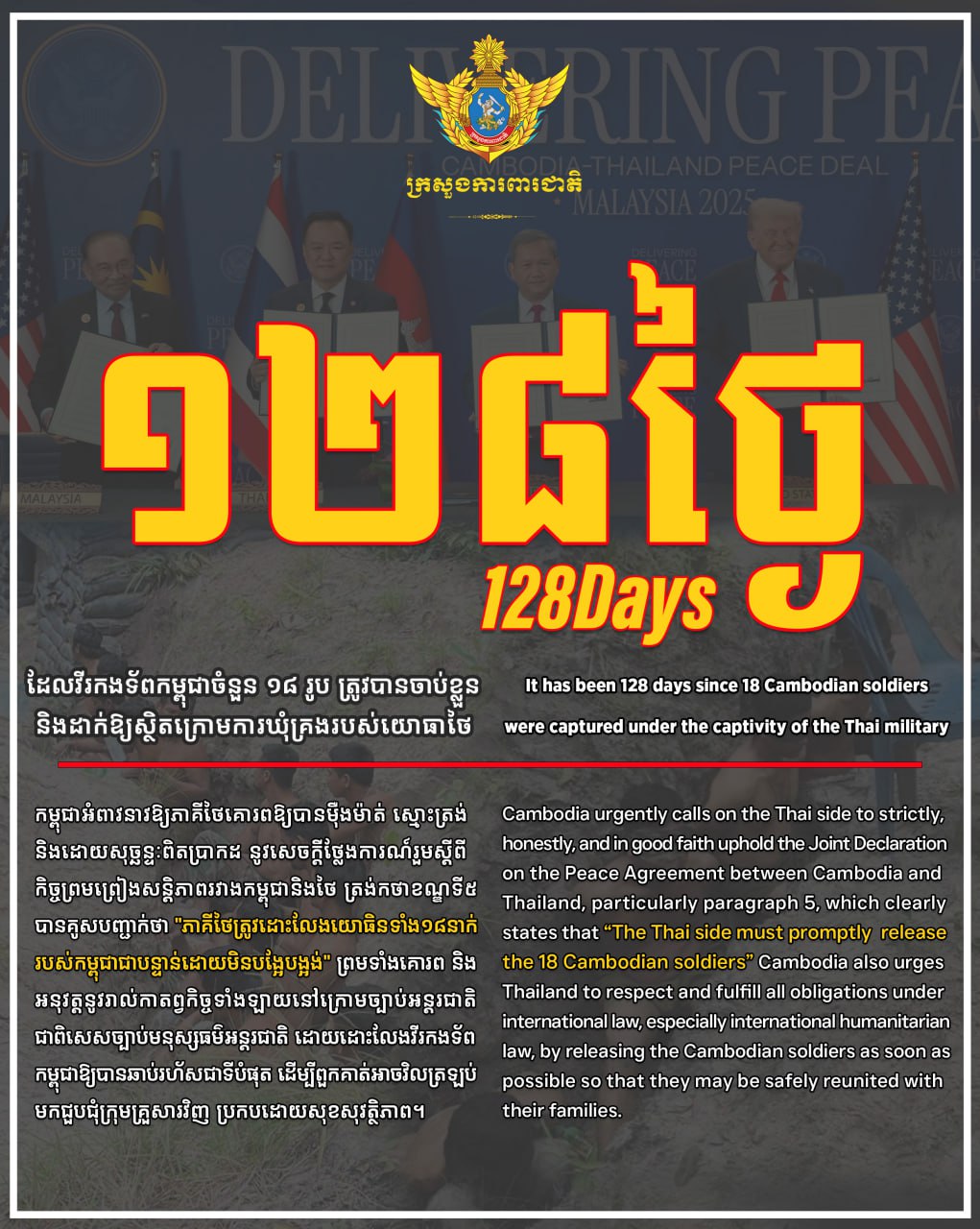 “The Thai side must promptly release the 18 Cambodian soldiers” Cambodia also urges Thailand to respect and fulfill all obligations under international law, especially international humanitarian law, by releasing the Cambodian soldiers as soon as possible so that they may be safely reunited with their families.