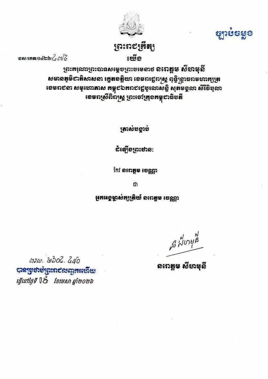 The promotion honours her contributions to the arts. She is the daughter of Princess Norodom Bophary, a granddaughter of the late King Father Norodom Sihanouk, and a niece of the reigning monarch.